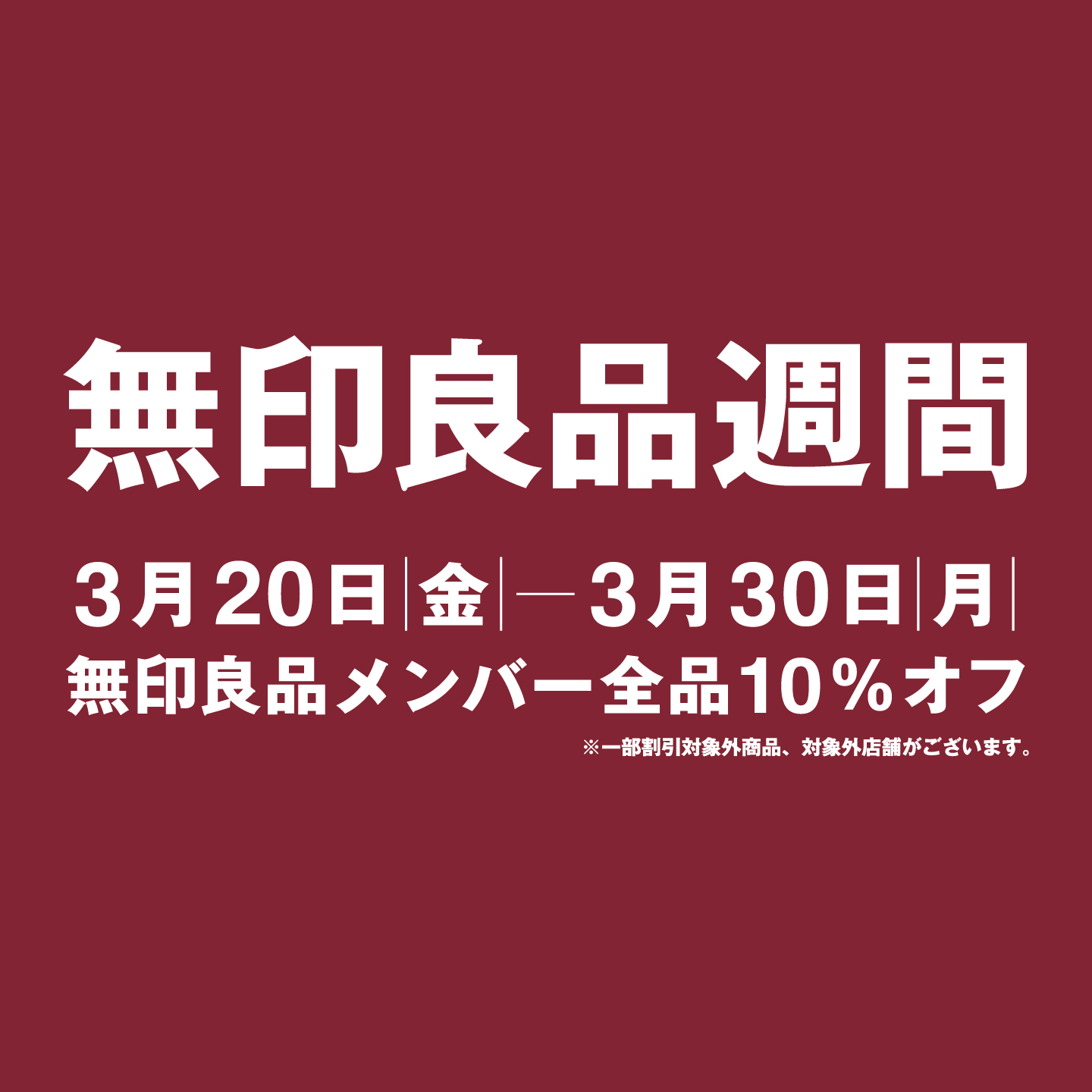 2026.03.16 共通 無印良品週間を開催します! 3月20日(金)~30日(月)まで無印良品メンバーを対象に全品(一部商品除く)が10%オフになる「無印良品週間」を開催します! 全国の店舗限定で開催となり、ネットストアは対象外となりますので、ご了承ください。 皆さまのお越しをお待ちしております。 株式会社ヘンミ Tweet Share +1 Hatena Pocket RSS feedly Pin it